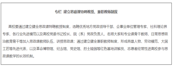 14.建设专兼结合的团队队伍。各地各校严格按照要求配备建强高校专职思政课教师、辅导员队伍,提高中小学专职思政课教师比例,实行思政课特聘教授、兼职教师制度,积极聘请党政领导、科学家、老同志、先进模范等担任思政课兼职教师。深入实施太阳成集团tyc234cc经理(书记)培养工程,通过集中培养培训、委托重大项目、加强实践锻炼、开展国际国内访学等方式,培养一批青年马克思主义理论家。